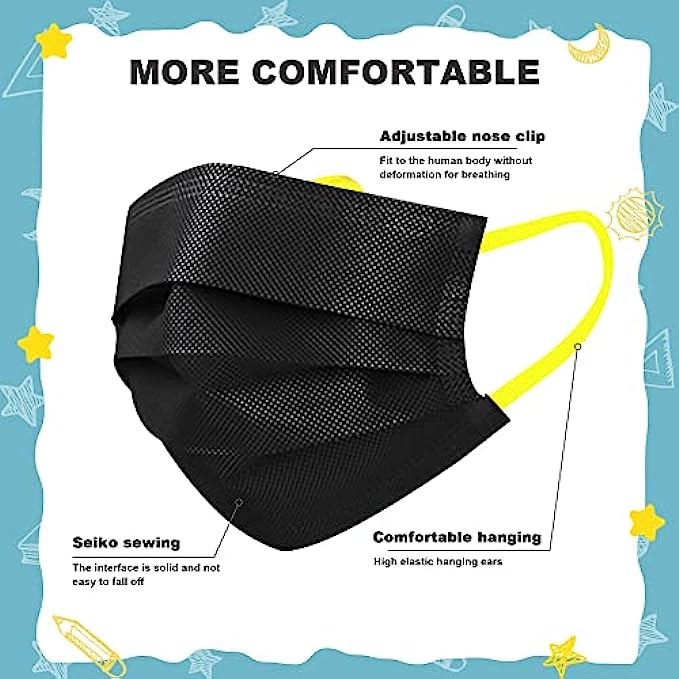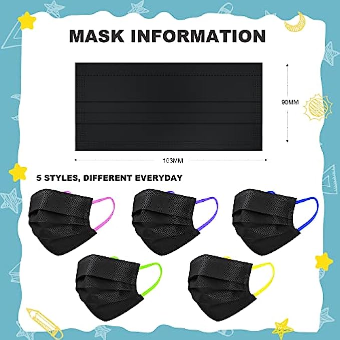 Sheal Kids 100PCS Individually Packaged Disposable Face Masks Black with Colorful Elastic Earloops Kids Face Masks For 4-12 Years Kids