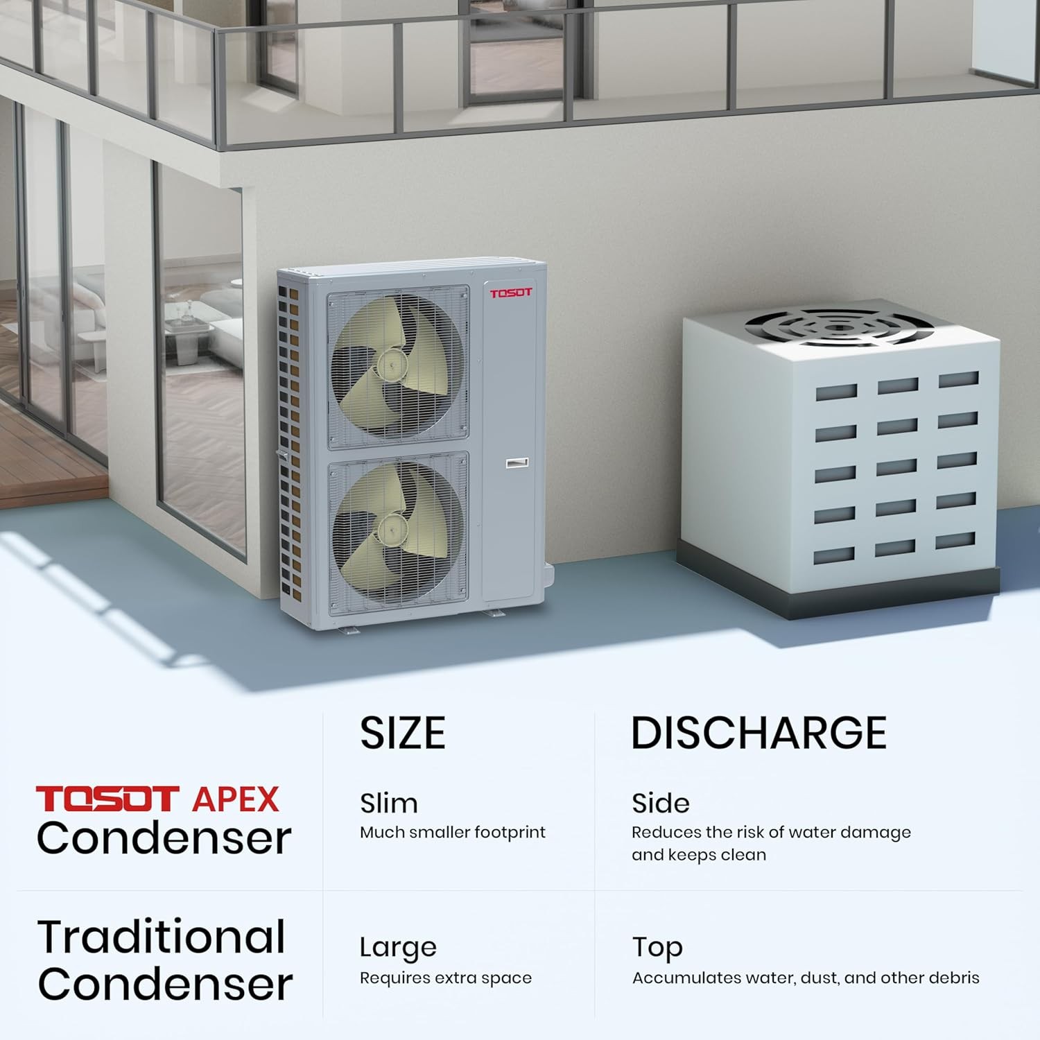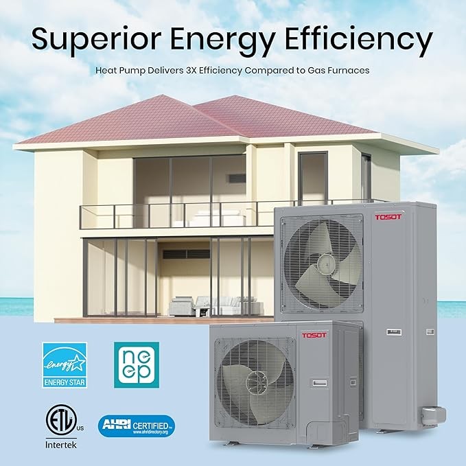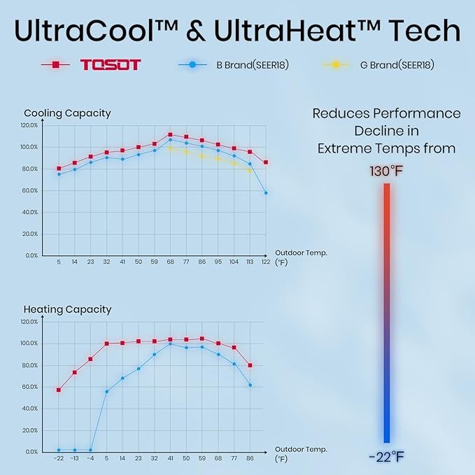 • UltraCool & UltraHeat Technology: Unlike traditional gas furnaces that only offer heating, TOSOT APEX heat pump split air conditioner heats and cools efficiently in extreme conditions from -22℉ to 130℉, whether in hot states like Arizona or cold states like Michigan