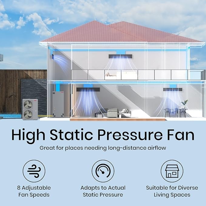 • High Static Pressure Design: The TOSOT unitary central AC adapts to actual static pressure, great for areas requiring long-distance airflow; meets the needs of various living spaces with eight adjustable fan speeds