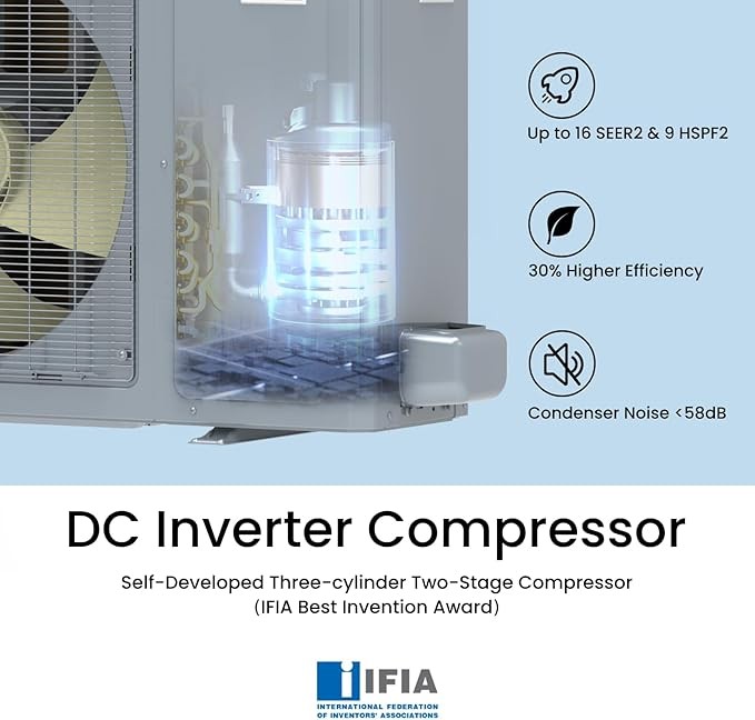 • Upgraded Condenser: The slim design takes up half the space of a gas furnace, fitting well in constricted areas like balconies or narrow side yards; side discharge design minimizes debris accumulation such as leaves and keeps noise levels below 58 dB