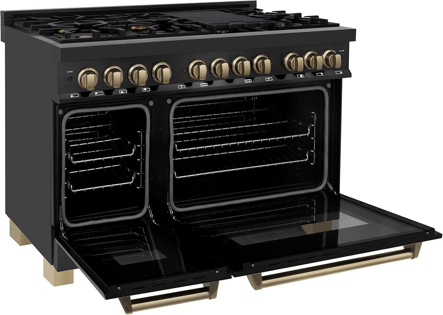 ZLINE Autograph Edition 48 in. 6.0 cu. ft. Legacy Dual Fuel Range with 7 Burner Gas Cooktop and 2 Electric Ovens in Black Stainless Steel and Champagne Bronze Accents (RABZ-48-CB)