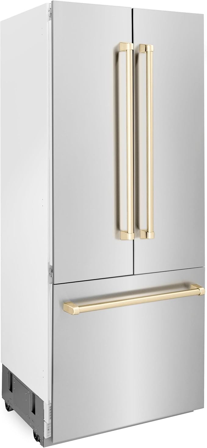 The ZLINE Autograph Edition 36 in. 19.6 cu. ft. French Door Built-In Bottom Freezer Refrigerator with Water Dispenser and Ice Maker in Stainless Steel with Polished Gold Accents (RBIVZ-304-36-G) provides the ultimate upgrade to the center of your home by pairing premium dual cooling technology with enhanced storage capacity for multiple grocery items. Achieve ZLINE Attainable Luxury excellence with innovative features designed to enhance your kitchen’s cooling and freezing capability
